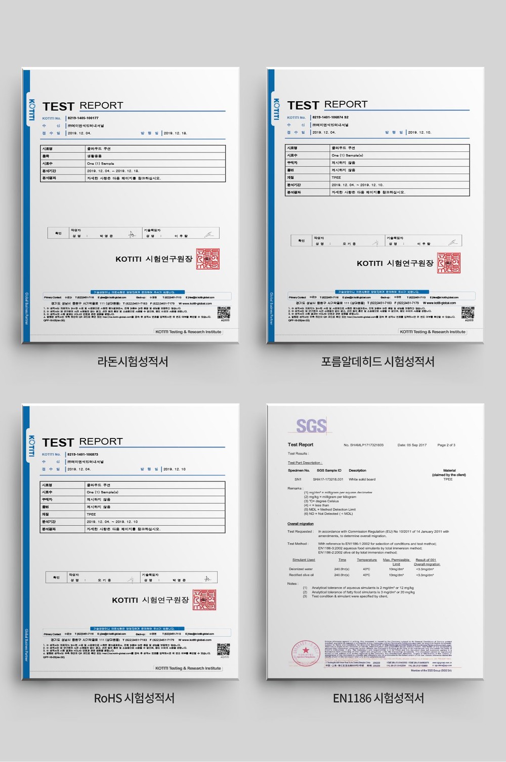 클라우드 쿠션은 탁월한 통기성과 탄성을 지닌 혁신적인 소재로 라돈 방출량 7.9Bq/m3 (국가 기준148Bq/m3)로 안심하고 쓸수 있으며 포름알데히드(HCHO) 등 유해물질이 없을 뿐아니라, 후처리가 아닌 물질 자체로 향균성이 있으며 음식물에 접촉(EN1186)해도 안전한 소재입니다. ![]()