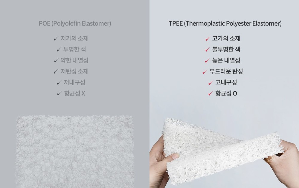 TPEE는 내열도가 높아 뜨거운 차안에 보관해도 변형될 가능성이 적으며 온열 기기와 사용해도 화재 위험성이 비교적 낮아 걱정 없이 사용할 수 있습니다.